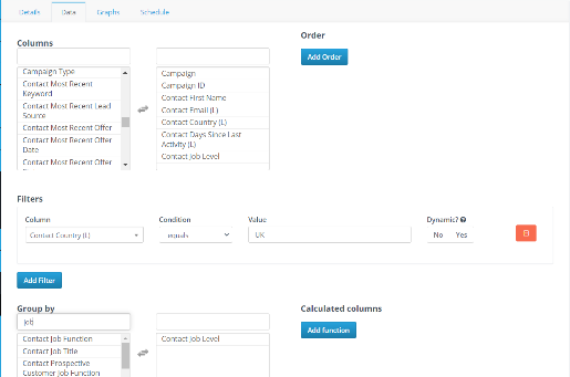 Similar solutions usually have a predefined table schema for reports, and you cannot change those easily. You would either need an admin account or you won’t be able to make changes at all. In that case, you might end up with a large table of data that will require additional efforts for further classification and data processing. In ACS, report filters will save your life! You can select if you want to generate a report about: campaign, form, landing page, email and so on, and then you can choose manually which columns to add to it. Don’t be scared! You don’t have to do this all the time because report templates can be saved and then reused (or modified) anytime.